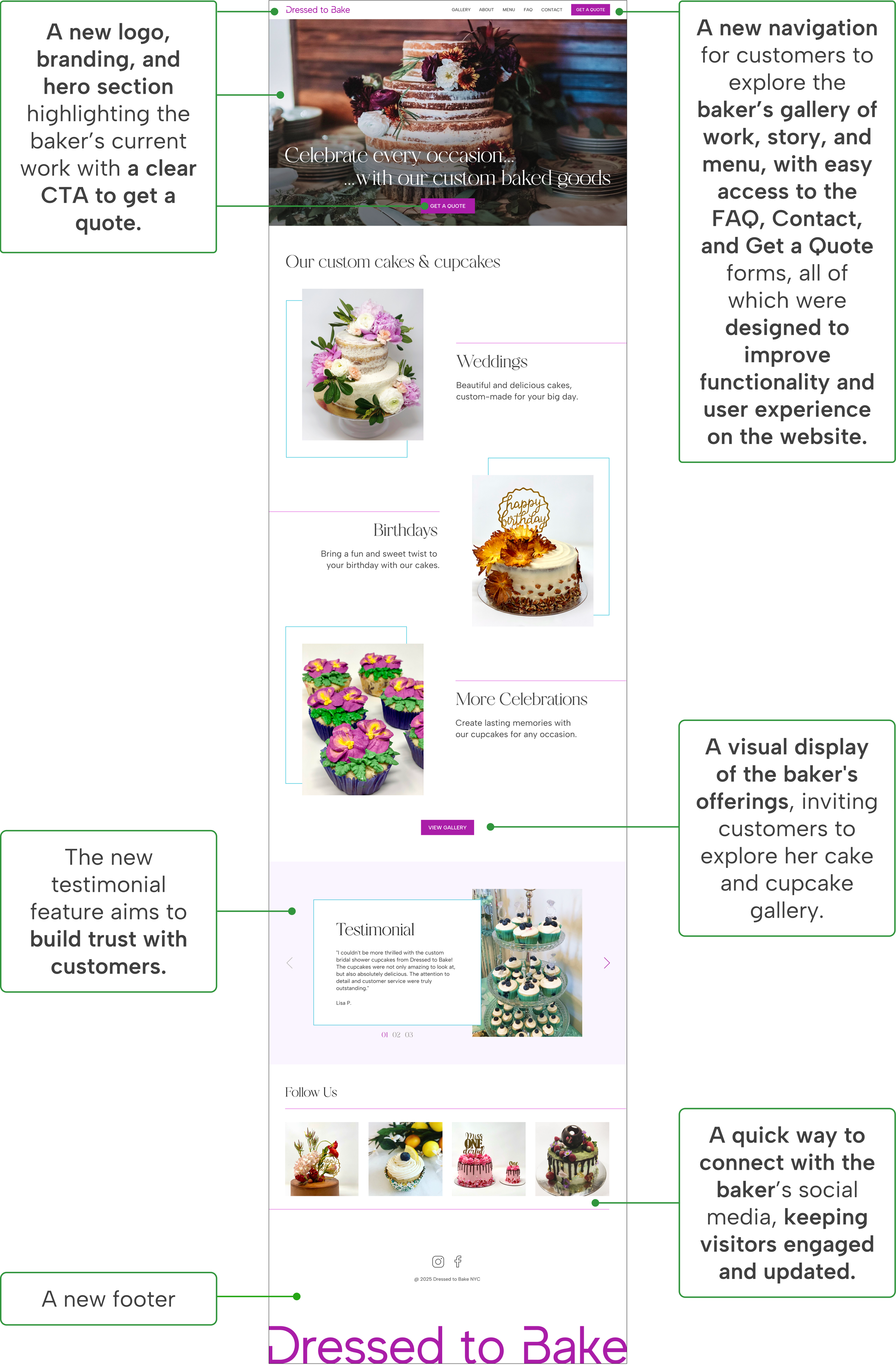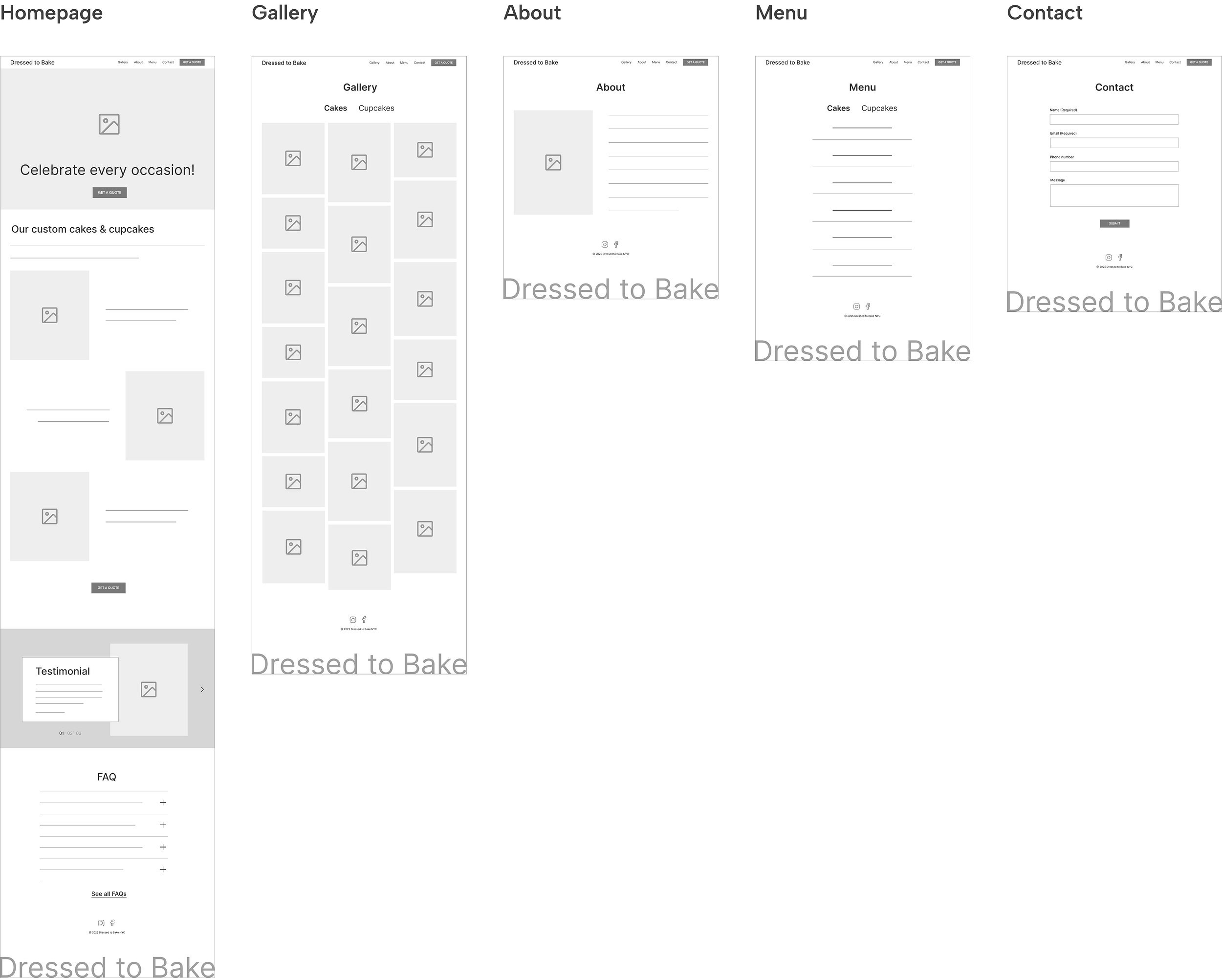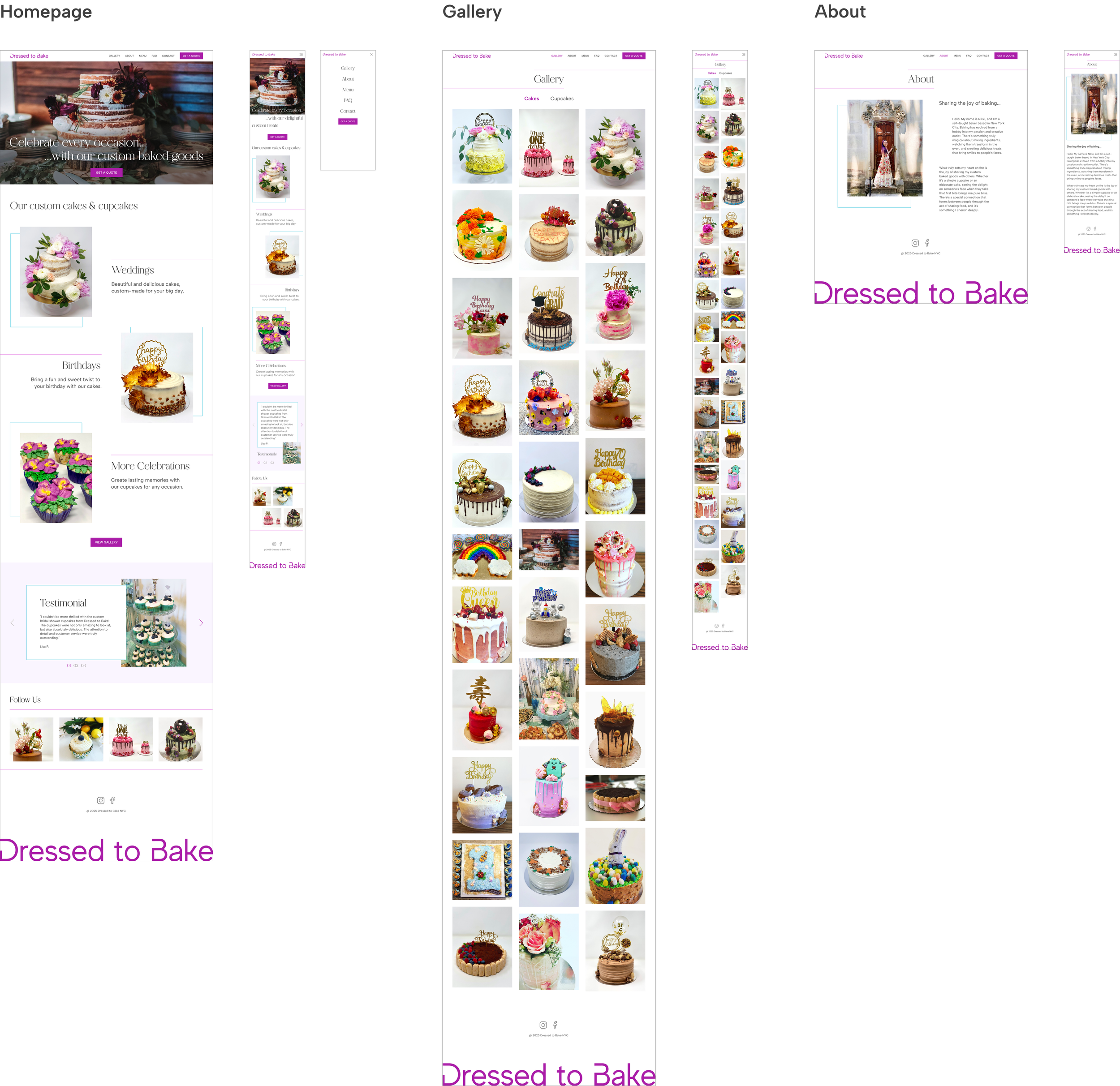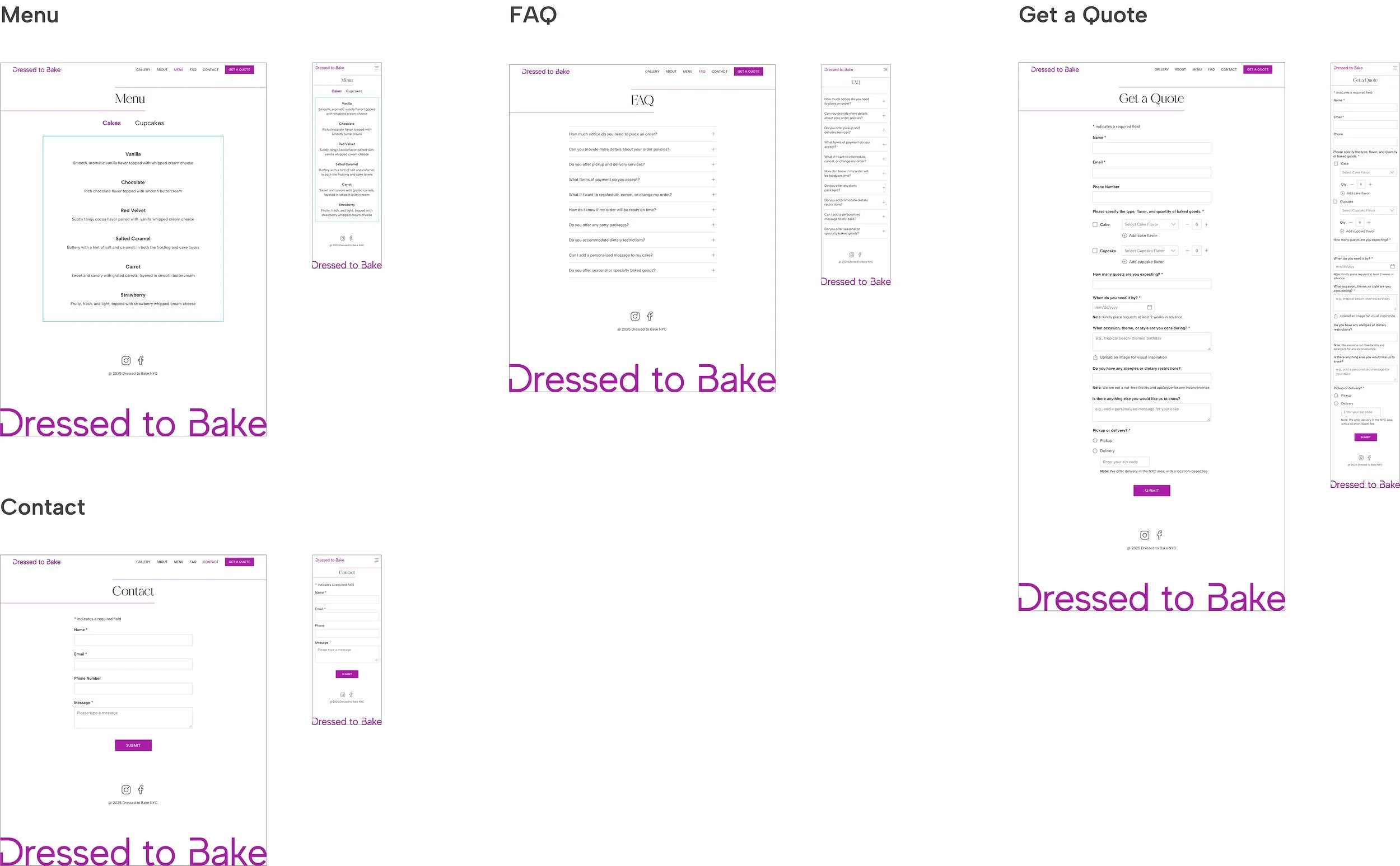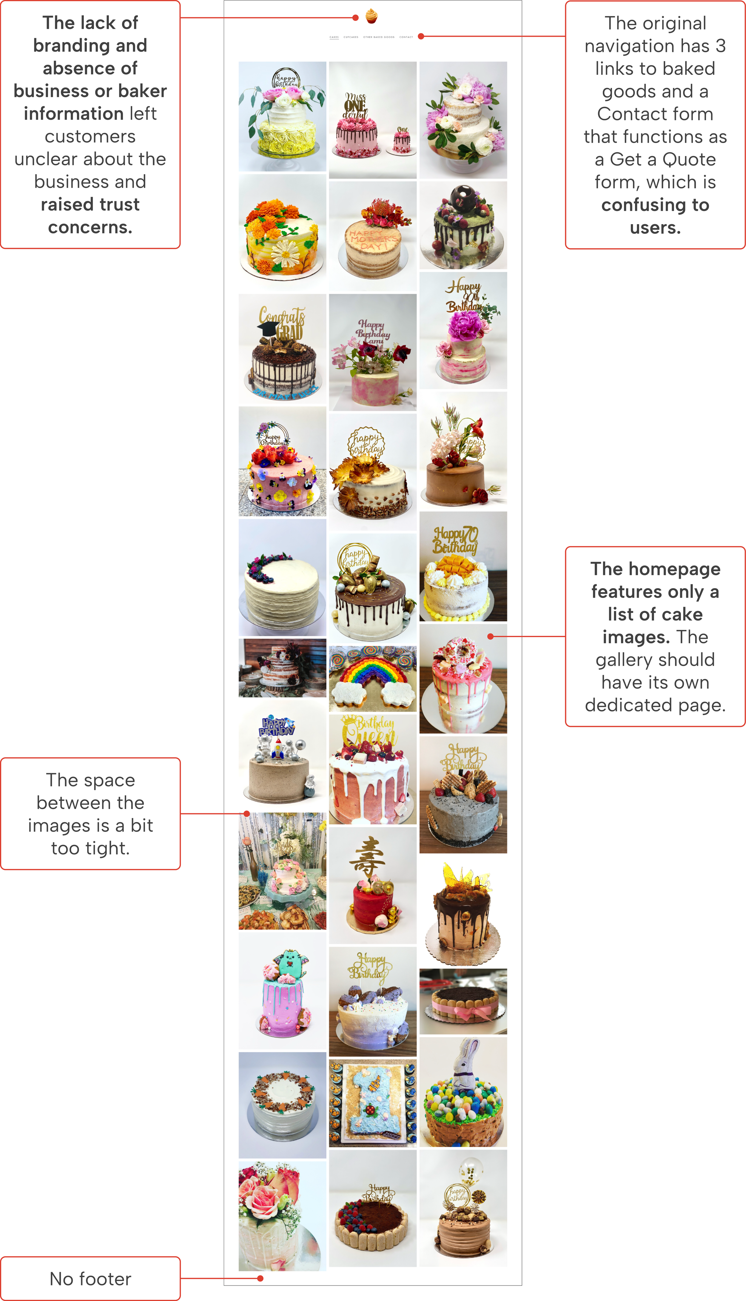 The Dressed to Bake website features only a gallery as the homepage and a contact form that functions as a quote request form. It lacks branding, key information, and usability, making it challenging for customers to navigate the website, understand her services, and trust her business.