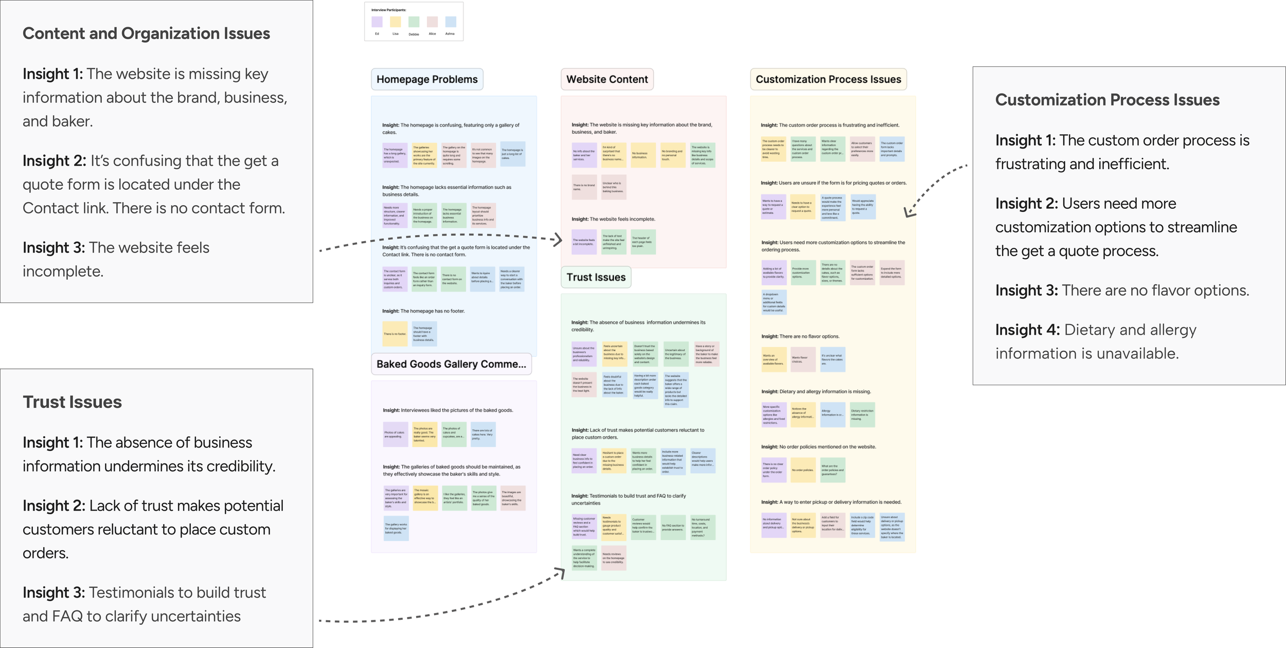 I utilized affinity mapping to uncover clusters of patterns and key insights that highlighted issues users had with the website.