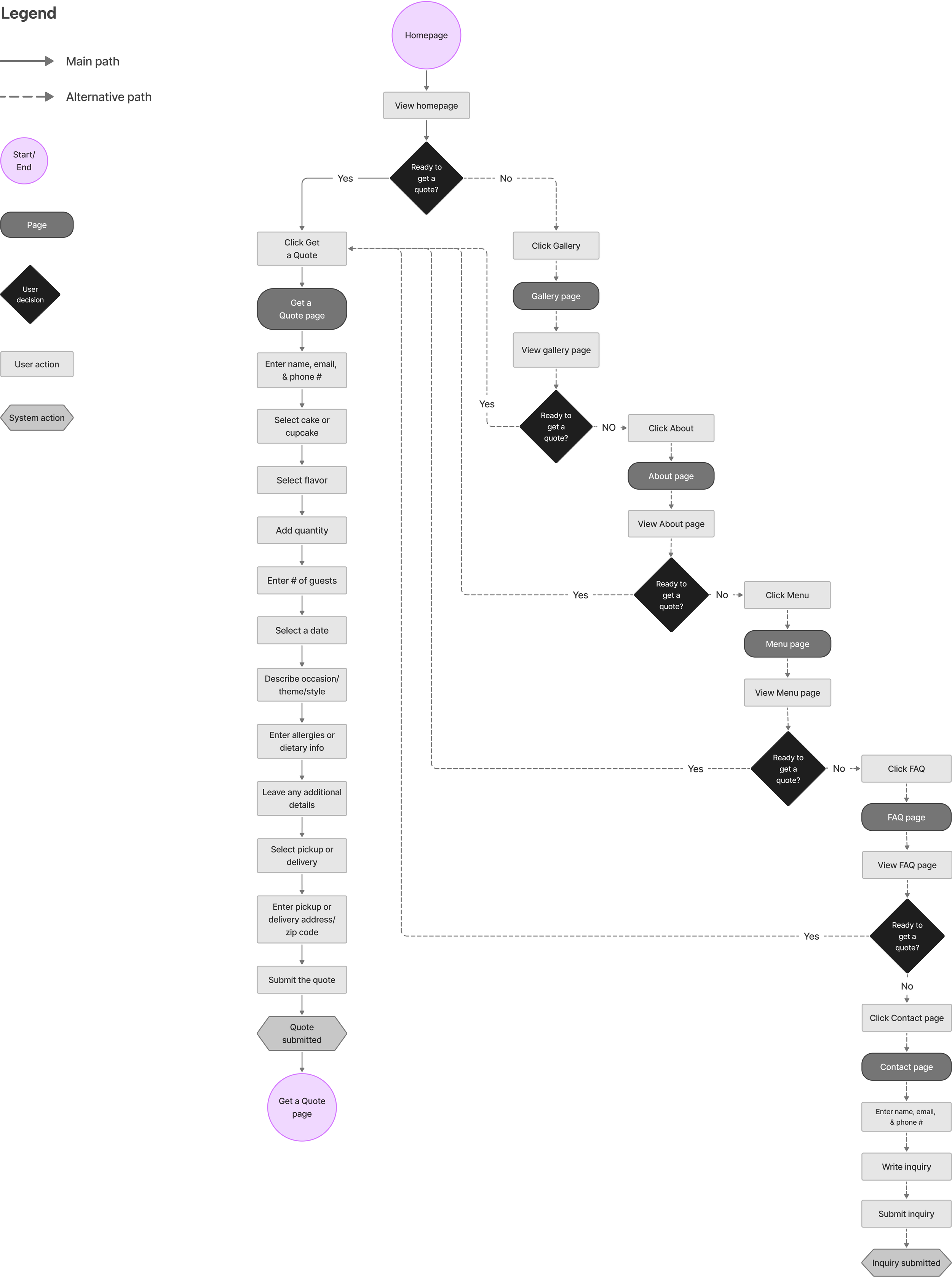 The main user flow is to learn about the business and request a customized quote. If users aren’t ready to request a quote, they can explore other features and submit a question via the contact form.