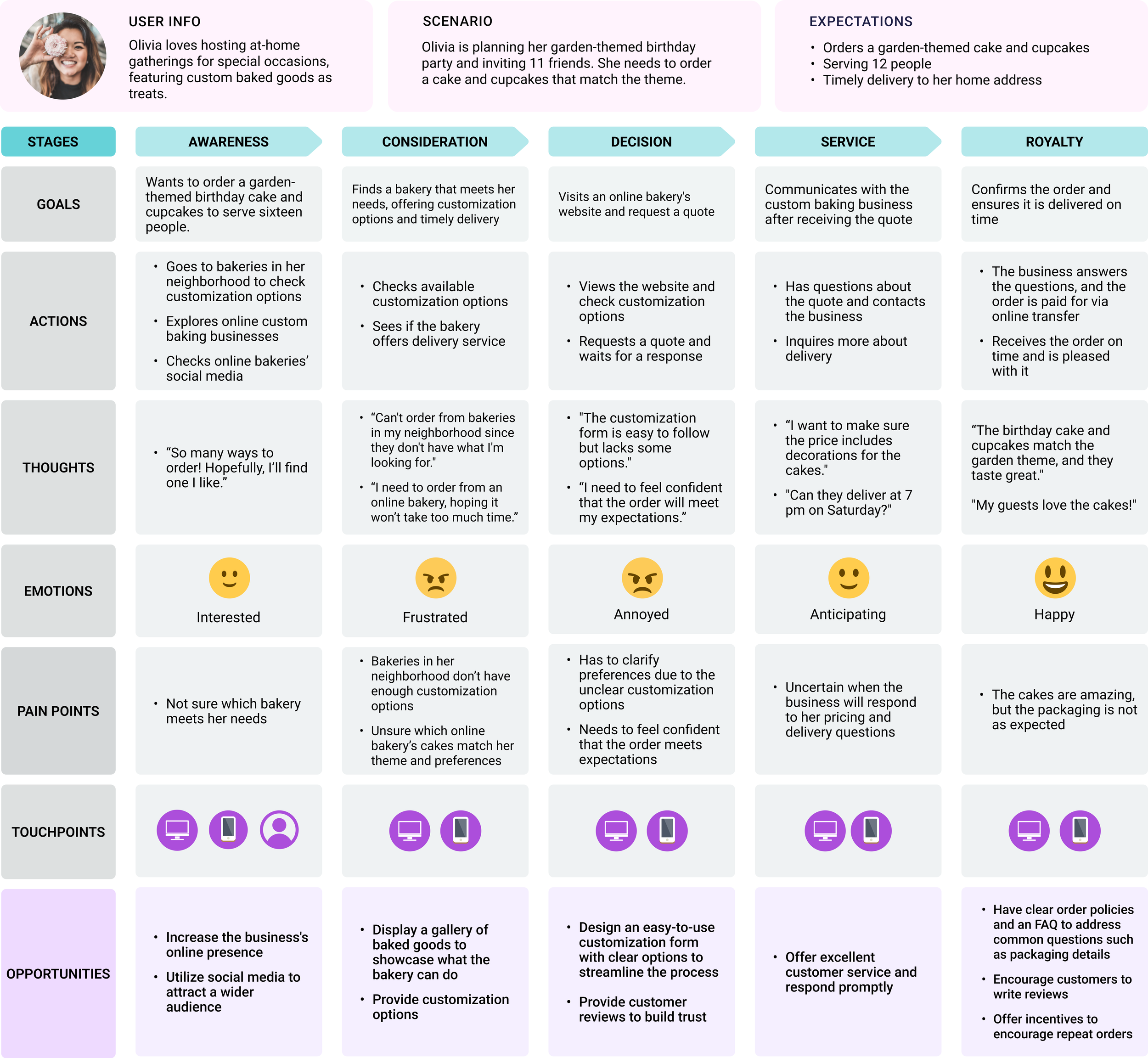 I created Olivia's customer journey map, detailing her experience buying custom baked goods online from awareness to post-purchase. This revealed the need to improve her experience by clearly presenting business offerings and enhancing the custom ordering process.
