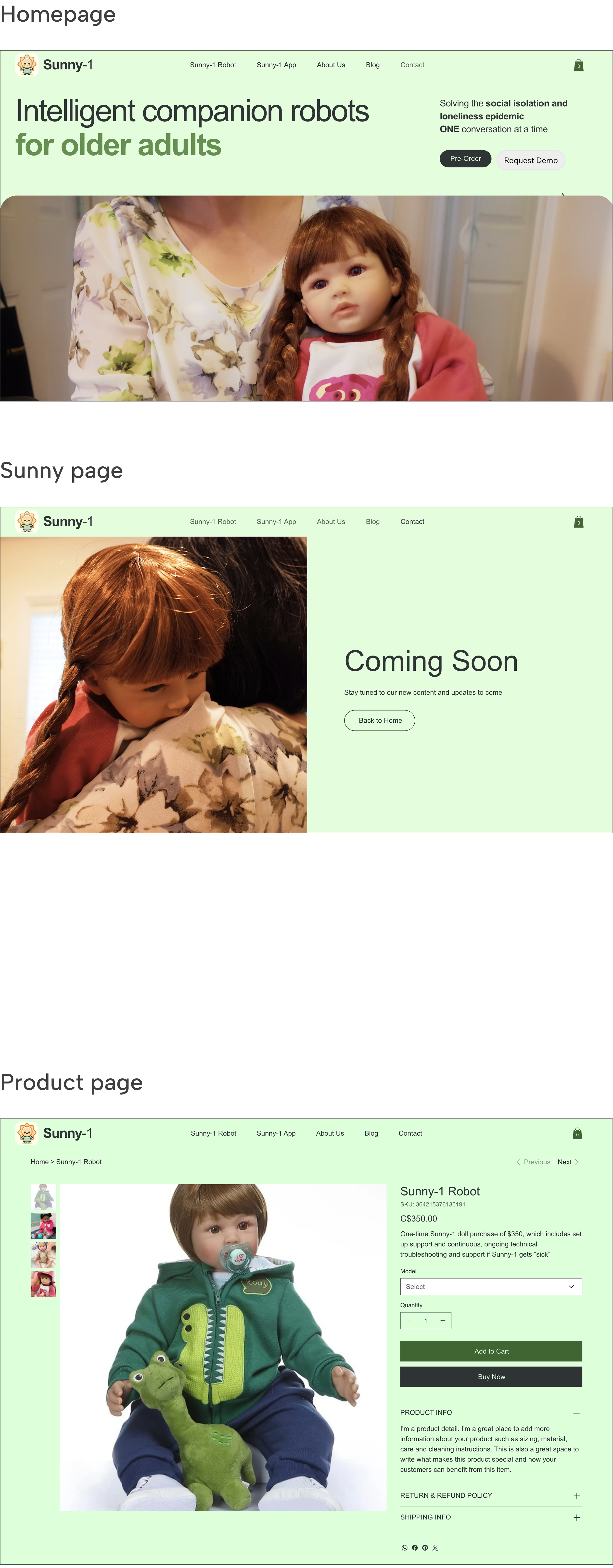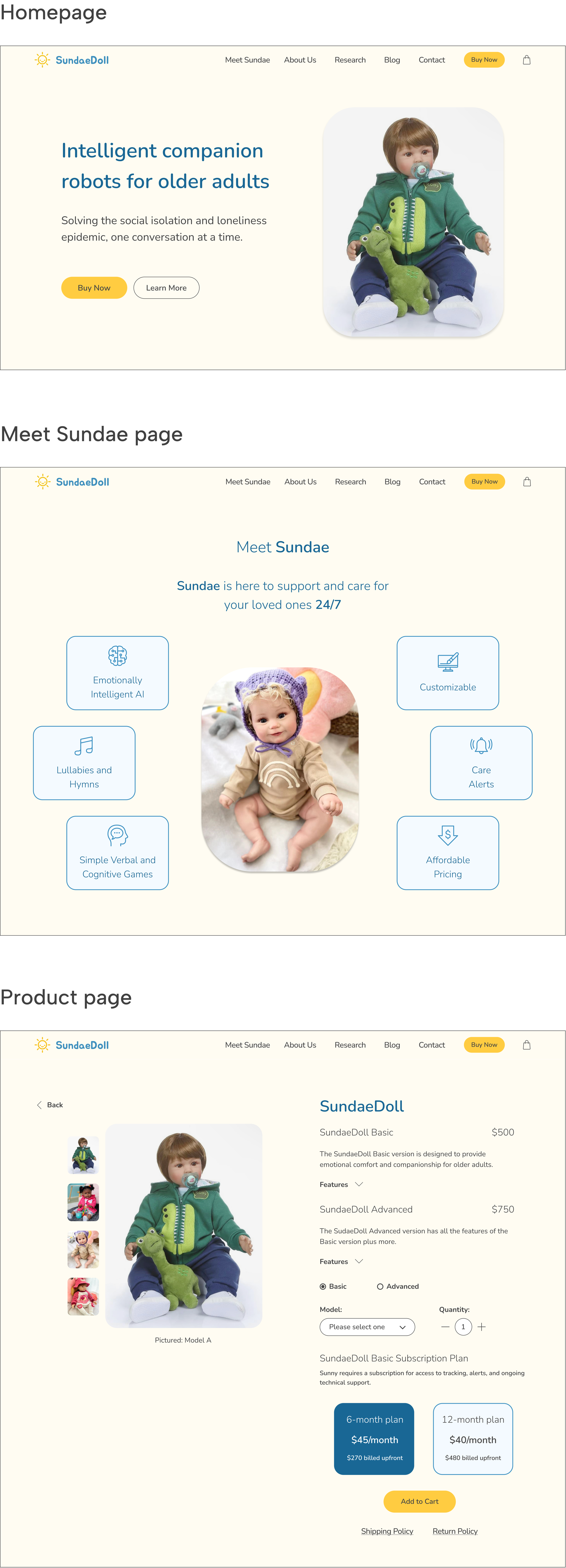 We created new pages for Meet Sundae, About Us, and Research to enhance credibility and build trust with customers by providing clear, detailed information about Sundae’s features, technology, safe data collection, AI safety, doll therapy, and clinical articles, as well as the company’s team and mission.