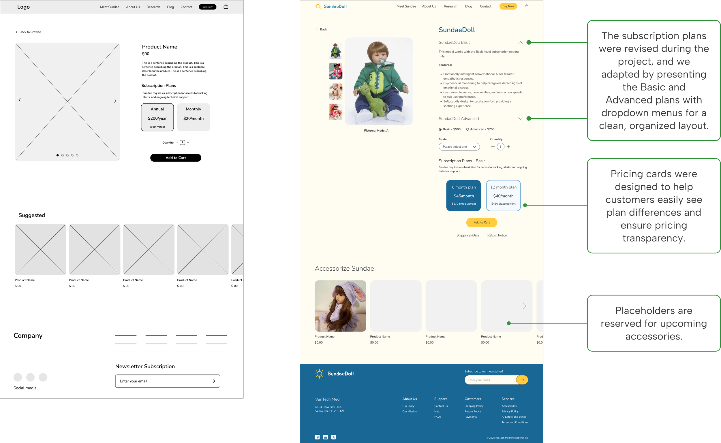 Once the must-have features were confirmed, we created a new site map to address the shortcomings of the previous website’s navigation. Our focus was on designing key pages: Meet Sundae, About Us, Research, and Product Shop.