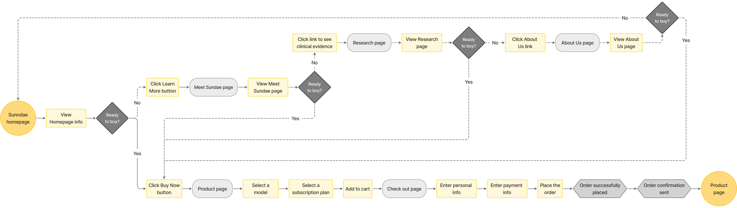 The user flow demonstrates how users navigate the website to learn about Sundae and make a purchase, ensuring a smooth and intuitive experience.
