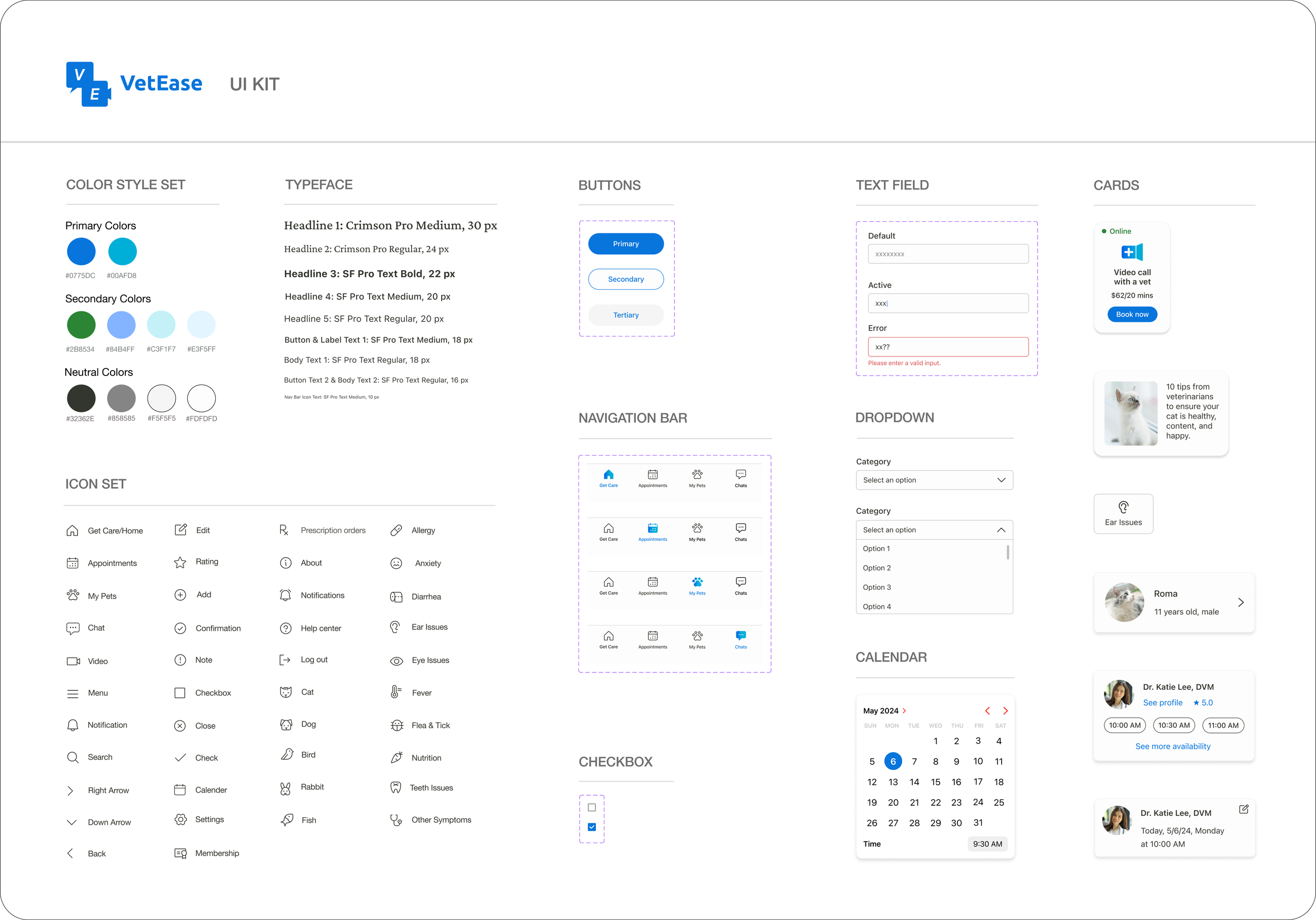 The style tile streamlines VetEase's visual identity across platforms, ensuring consistency in reflecting brand values and fostering user engagement. Having the style tile as a reference helped me align the design with brand objectives.